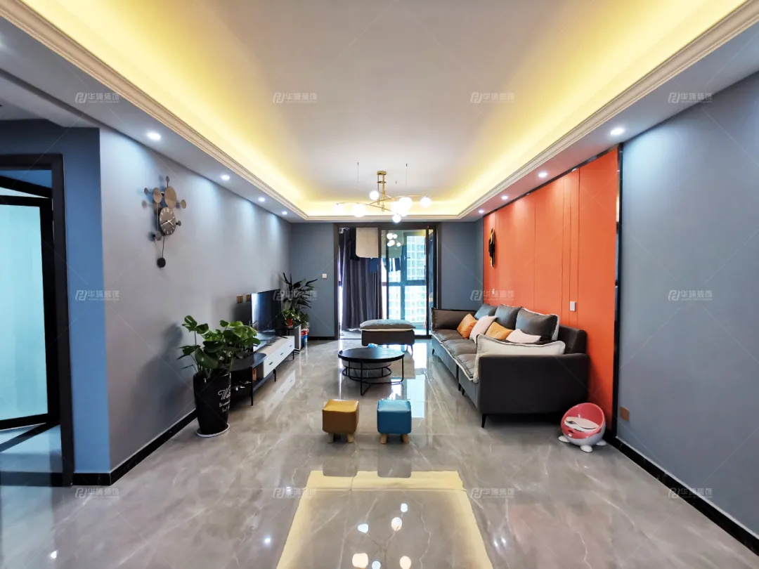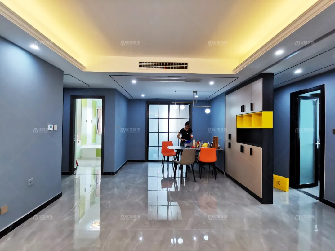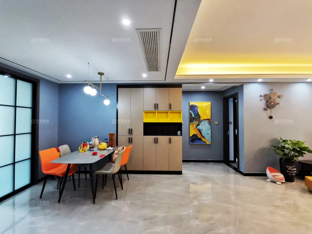 整個(gè)空間的墻面是以藍(lán)色貫穿到底的,通過沙發(fā)背景的愛馬仕橙完成跳躍,冷暖相生相克,讓色彩的魅力以及生活的緊迫感得到了徹底釋放。