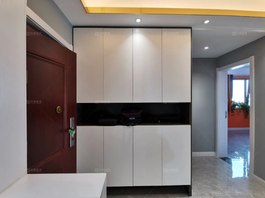 入戶是一個通廊,左后方是臥室,右側(cè)是洗手間,設(shè)計師以玄關(guān)柜和L型門套的形式作為空間區(qū)域的劃分,既滿足了功能需求,也起到了美觀的效果。