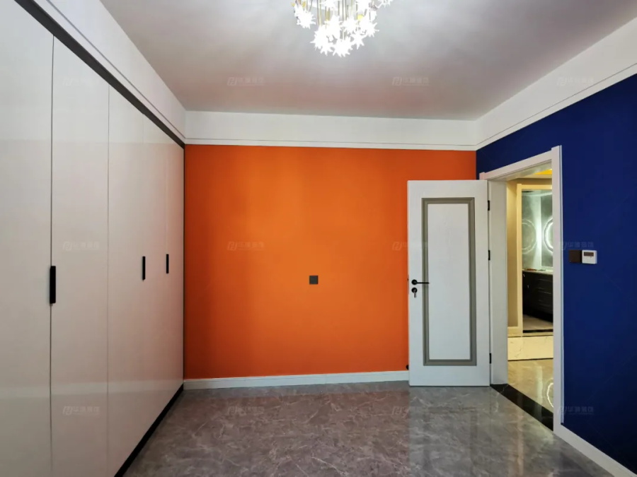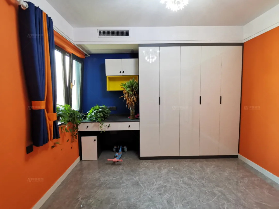 次臥是寶寶房,愛馬仕橙與深藍色搭配,留下碰撞的火花。再加上小鹿吊燈的星星點綴,又活躍又跳脫,滿載趣味性。