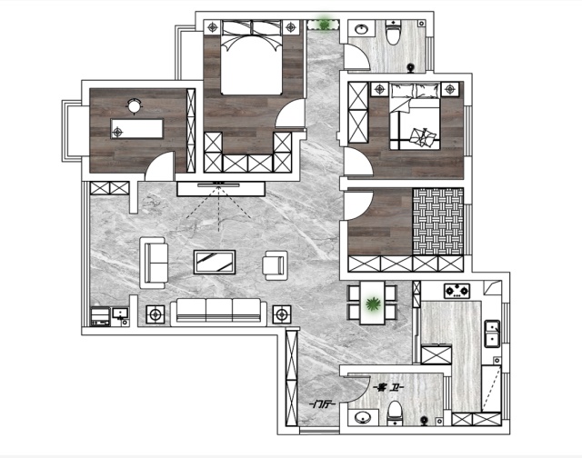 2)利用隱藏的書(shū)房門體做對(duì)稱的沙發(fā)背景。