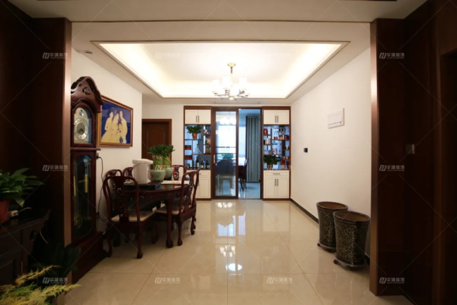本案常住人口就叔叔阿姨自己,146平的空間對(duì)于他們來(lái)說(shuō)足夠?qū)挸?,可以包容他們所有的喜好。因?yàn)榘⒁逃绕溏姁?ài)古樸笨拙的中式家具,所以設(shè)計(jì)師在做風(fēng)格定位的時(shí)候,在傳統(tǒng)中揉合現(xiàn)代,又于現(xiàn)代中透著古典,用交叉融合的設(shè)計(jì)手法,來(lái)提升整個(gè)空間的格調(diào)。