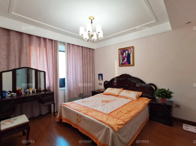 整個(gè)大環(huán)境以厚重的木色和輕柔的淺色做冷暖對(duì)比,電視墻在壁布的基礎(chǔ)上疊加護(hù)墻板和金屬線條做隱形門(mén)及對(duì)稱(chēng)設(shè)計(jì),沙發(fā)背景則是壁布之上裝飾字畫(huà)。繡花包邊的紋理,鎏金的色彩,再加上家具的沉穩(wěn),將延宕千年的中式古風(fēng)韻味凸顯。