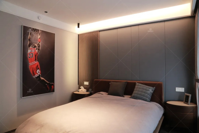 主臥:木質(zhì)格柵+硬包背景、自由旋轉(zhuǎn)式吊線燈