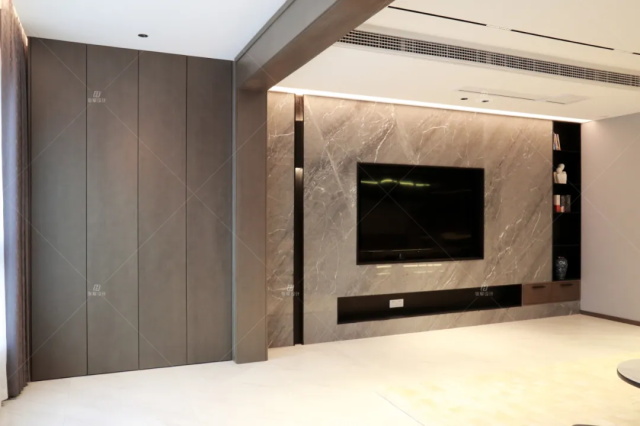 電視墻:灰色石材+不銹鋼包框