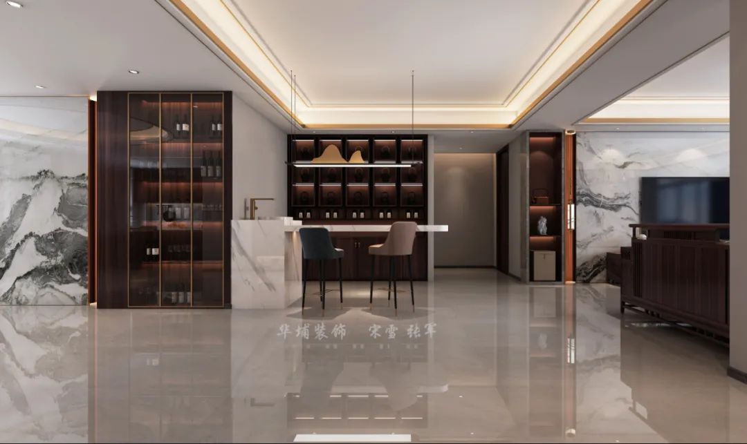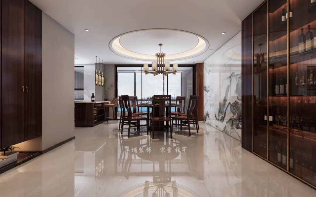 門廳十字園林布局重新規(guī)劃,以酒柜+搗臺形成一個入戶端景,視覺效果也更加開闊。