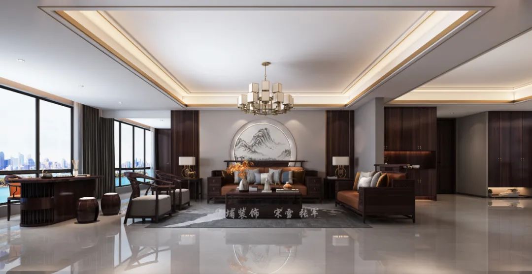 沙發(fā)背景是硬包內(nèi)嵌圓形掛畫,寓意“背有靠山”,代表生活情感的寄托??蛷d頂面采用疊級雙層邊吊,再以金屬線條封邊,方顯大氣。家具全部是紫檀木,彰顯高貴。