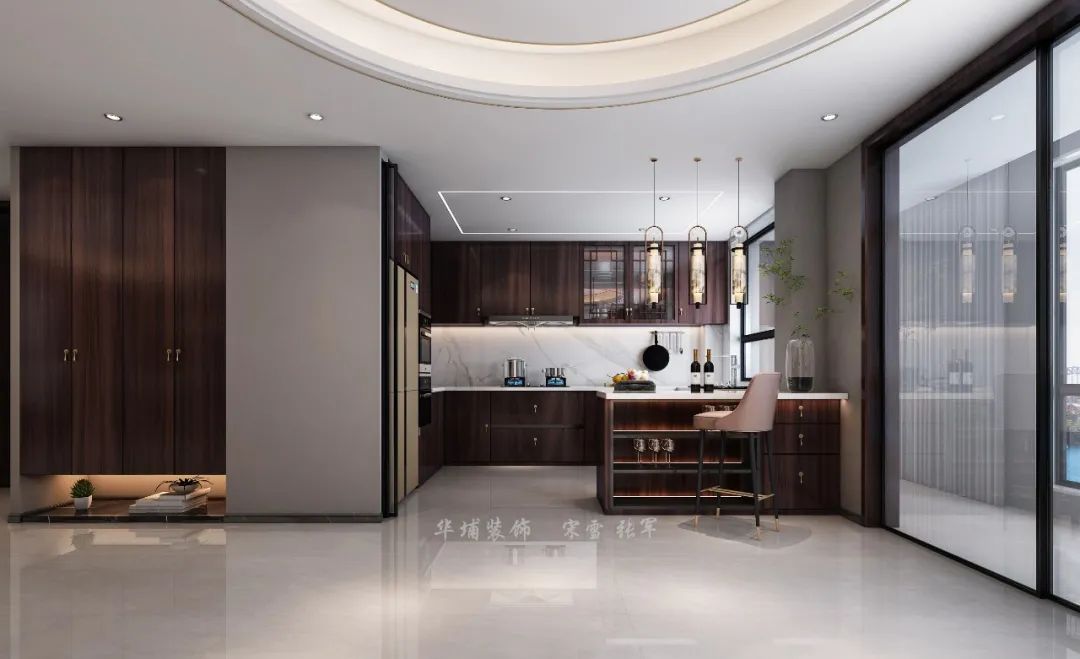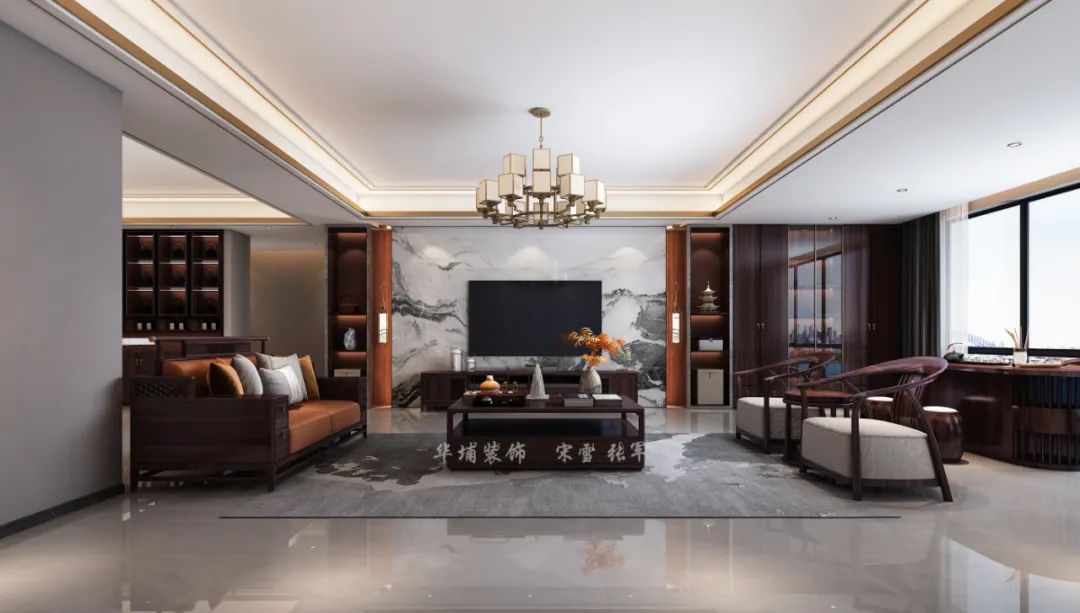 整案定位新中式風(fēng)格,以紫檀色貫穿始終。室內(nèi)多采用對稱的布局方式,在裝飾細節(jié)上崇尚自然情趣,賦予空間變化。