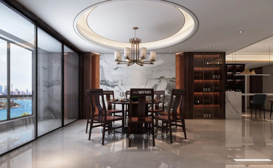 餐廳,天圓地方。頂面圓形燈池設(shè)計與餐桌相輔相成,背景墻又與客廳電視墻遙相呼應(yīng),將中式的對稱美學(xué)繪畫。
