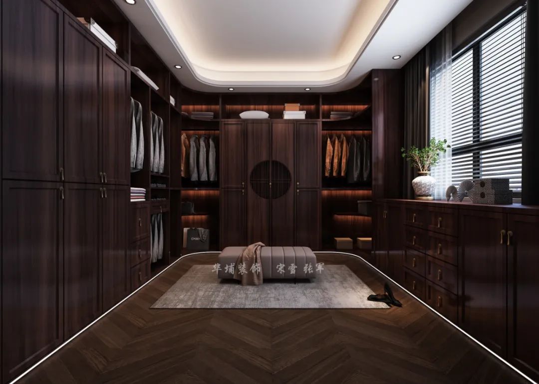 衣帽間呈U字型,清一色的紫檀將主人尊貴的身份彰顯。