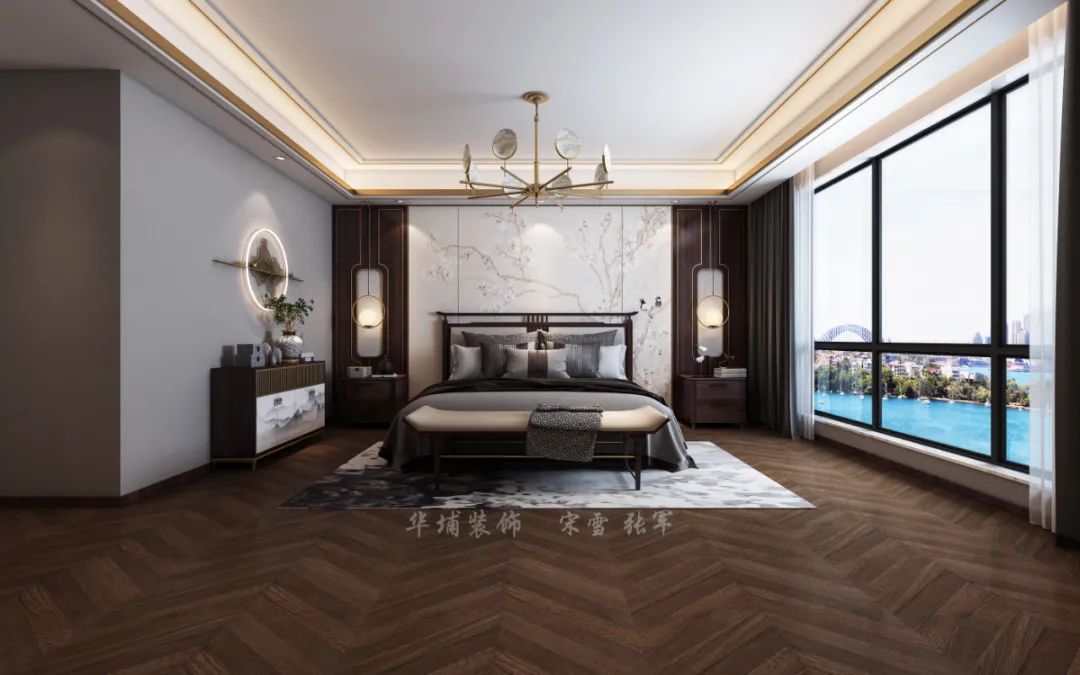 主臥墻面是硬包中式花鳥,喜鵲盈盈臥枝頭,一副祥和熱鬧的景象。地面是魚骨拼的紫檀木地板,非常漂亮,同時也做到了全屋格調(diào)的統(tǒng)一,充滿趣味性。