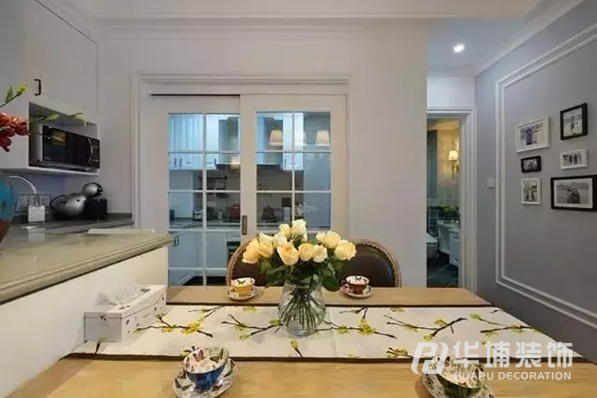 廚房延續(xù)了整個空間溫馨的氛圍,選用了白色的櫥柜和白色的廚房移門,地磚跟墻磚則采用了較花哨一點的花磚,穩(wěn)重中又不失俏皮。