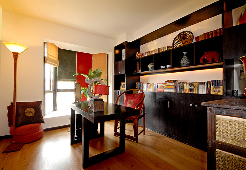 在書房設(shè)計凸顯混搭效果,家居的搭配充分體現(xiàn)了現(xiàn)代簡約風(fēng)格的簡潔、明快的特點,以及中式的典雅韻味。