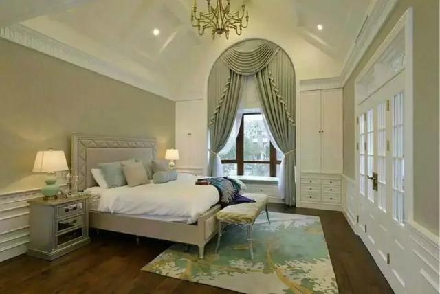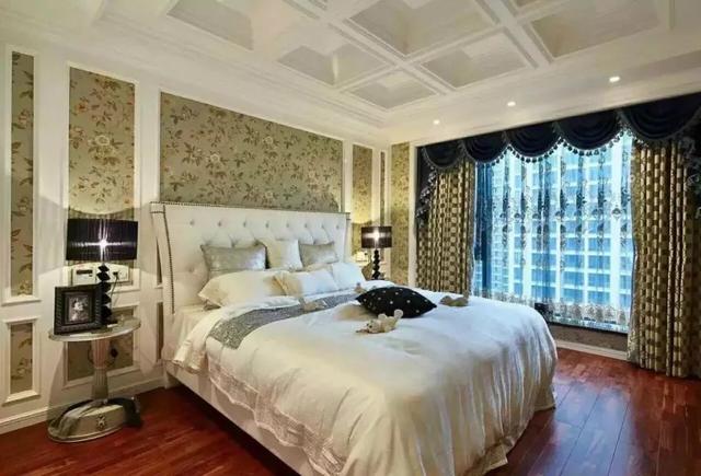 本案設(shè)計(jì)整體采用淺色系,燈飾突出,主臥墻面款式新穎,部分采用壁紙,造型突出立體感。主臥墻面采用顏色粉刷,搭配白色柜子,溫馨浪漫。