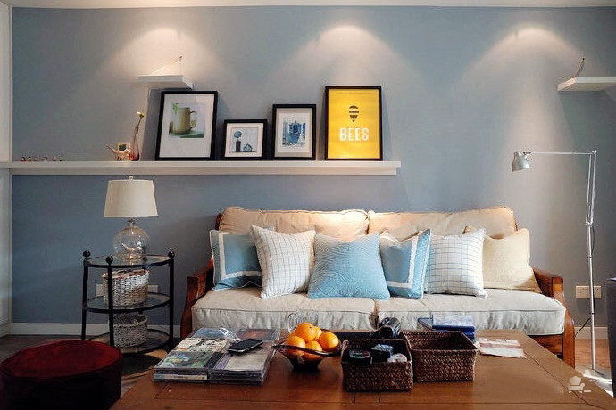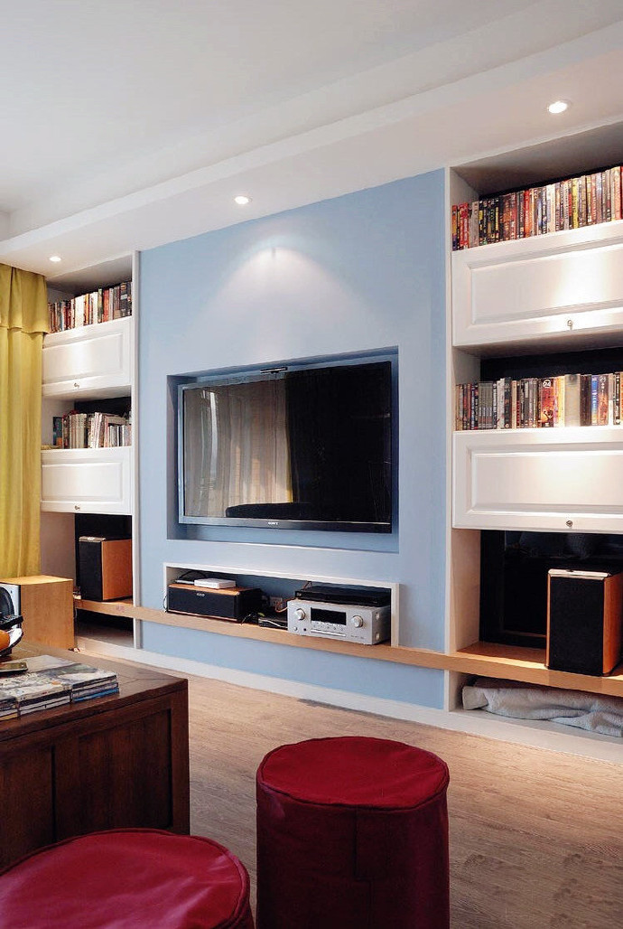 書(shū)柜收納作電視背景墻,淡藍(lán)色的色彩搭配,更顯清新