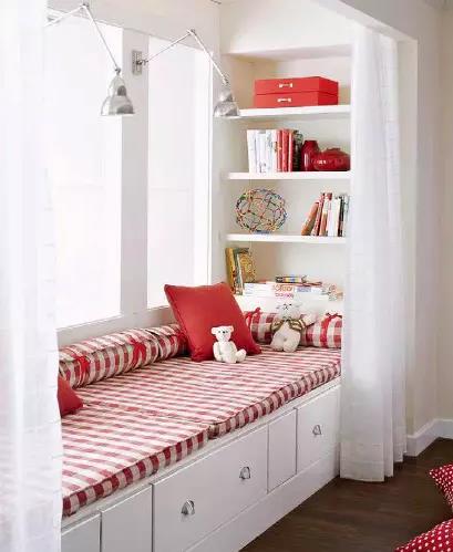 3、在側(cè)墻做柜體。用木地板做臺面,鋪墊子。優(yōu)點是施工方便,整體顏色和臥室比較搭配,飄窗處還可以做小憩的空間。