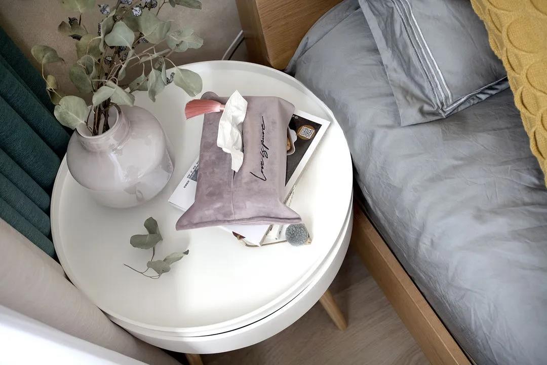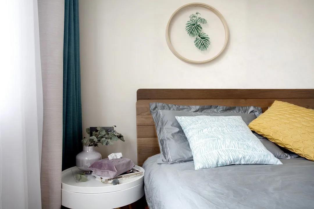 陽光微淡,歲月靜好,安然如素。臥室大繁至簡,大量用中性色卻十分溫馨。床頭背景墻用到柔柔的杏色,搭上綠植掛件,清新優(yōu)雅。